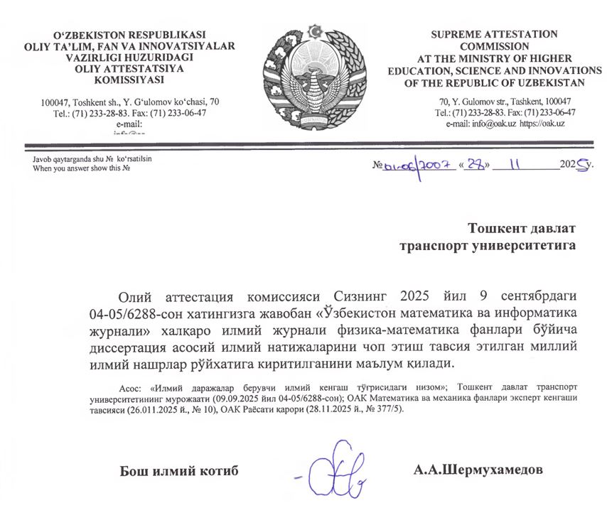 В соответствии с решением Высшей аттестационной комиссии международный научный журнал Uzbekistan Journal of Mathematics and Computer Science включён в перечень национальных научных изданий, рекомендованных для публикации основных научных результатов диссертаций по физико-математическим наукам (решение Президиума ВАК от 28 ноября 2025 г., № 377/5). Научные статьи, опубликованные на русском языке в журнале Uzbekistan Journal of Mathematics and Computer Science, переводятся на английский язык и публикуются в журнале Journal of Mathematical Sciences (JMS) издательства Springer Nature, индексируемом в международной базе данных Scopus. Всем опубликованным статьям присваивается идентификатор DOI, и они индексируются в международных базах данных Crossref, ResearchGate и Google Scholar.